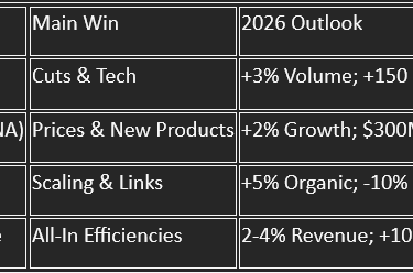 - Money Talk: Hit 2-4% growth in 2026; hold dividends; mull $1 billion in bottler sales.